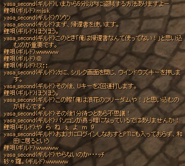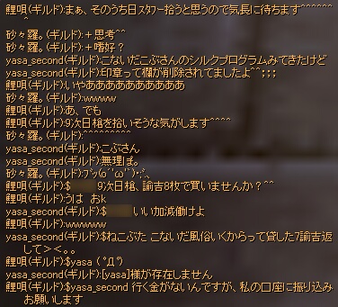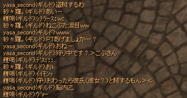 sasara*です!ギルチャがにぎやかなのはいい事です!だがしかし、ギルチャがしたいので、狩りができない…のと、ログ撮影に必死になりますw