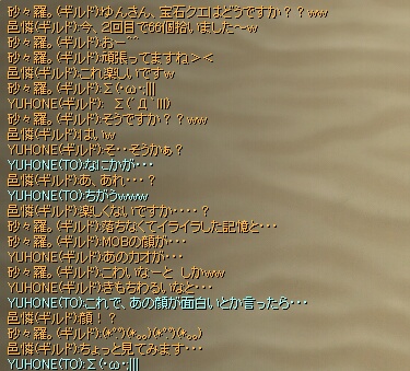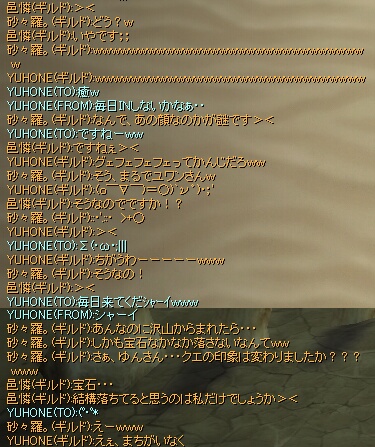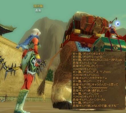 すると、敦煌特産付近でゆんさんに遭遇…職業仮名だったのですが、街用装備だったので白チャで挨拶をしてみました。