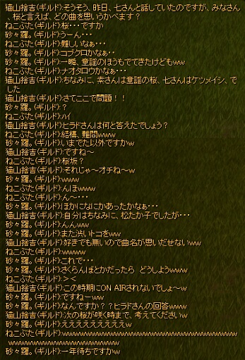 兵士クエの最中、スティキチさんが前日の晩にあった話をしていたのですが……どうやら、桜で思い浮かぶ曲についてだそうでw