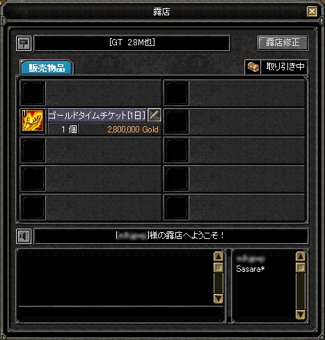 皆様、おひさしぶりです。日々LVアップに邁進しております。ささらんの露店の、日印章・道服が欲しくて値引き交渉中。居直り強盗と呼ばないでW。ただケタを・・0を一つ取って欲しいだけョ。さもなくば万引きか・・満タンの衛生車で突っ込もうかとW